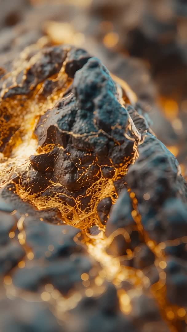 AI Generated Image. Vertical macro footage showing porous igneous rock with molten veins glowing amber and releasing tiny sparks. Camera shifting through crevices while surface pulsing with molten glow and bokeh highlights adding cinematic depth. High-detail texture and warm-blue contrast creating dramatic geological mood. Shooting in vertical 9:16 aspect ratio for mobile and social platforms. Perfect for science and geology explainers, volcanic visuals, background for title sequences, app intros, social media vertical ads, music visuals, festival projections. Use as loopable background, overlay for text, or cutaway in documentary sequences. Adjust color grading and speed ramping to match narrative tone or loop seamlessly for ambient motion.
