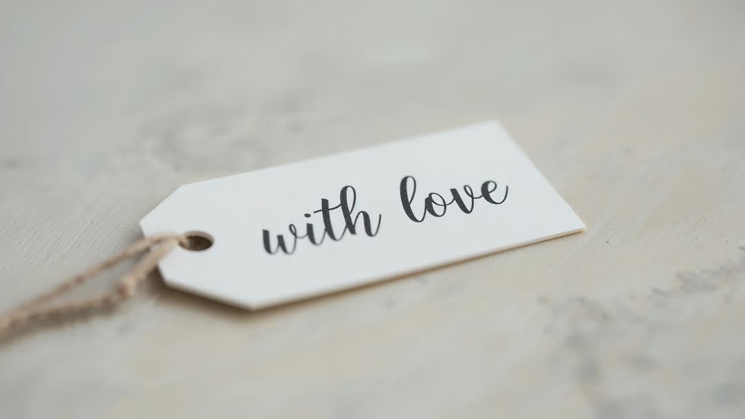 - Macro video focusing on white gift tag reading 'with love' calligraphy on pale tabletop