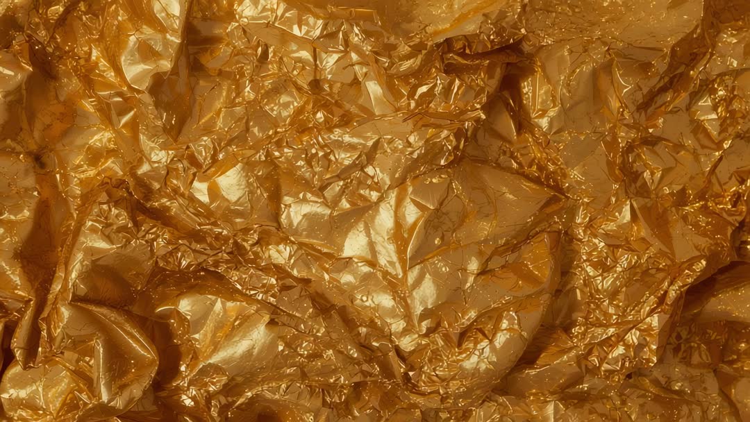 AI Generated Image. Macro video showing crumpled gold foil catching shifting studio light. Glitter flecks sparkling across reflective creases while highlights moving with subtle camera pan. High-contrast metallic sheen and tactile texture creating luxurious abstract motion. Useful for luxury branding, product packaging backgrounds, website hero loops, social media ads, holiday promotion, fashion lookbooks, motion graphics overlays. Easy to layer with text or logos and to use as decorative transition in video edits. Loop-friendly composition and warm golden palette delivering premium, celebratory atmosphere for seasonal campaigns and event visuals. Provide alternate looks by slowing footage, adding color grading, or applying soft blur and bokeh for dreamy effects.