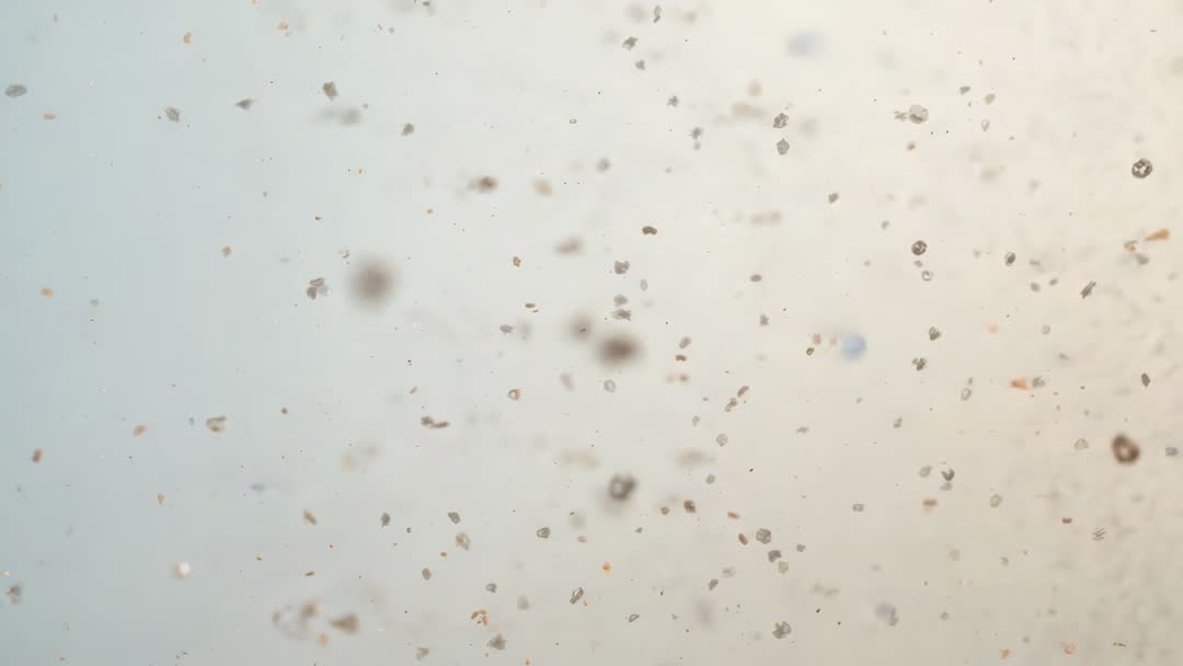 AI Generated Image. Macro video showing tiny dust specks floating and drifting through soft, neutral gradient. Particles moving slowly with shallow depth of field and delicate bokeh highlights. Minimal, abstract motion creating calm, airy atmosphere for use as background or overlay. Suitable for website headers, title screens, product presentations, lifestyle videos, cleaning or air quality topics. Loopable clip with neutral color palette and subtle motion allowing text or graphics placement over negative space. Recommended uses include cinematic transitions, promotional reels, environmental awareness pieces, product closeups, mood-building interstitials.