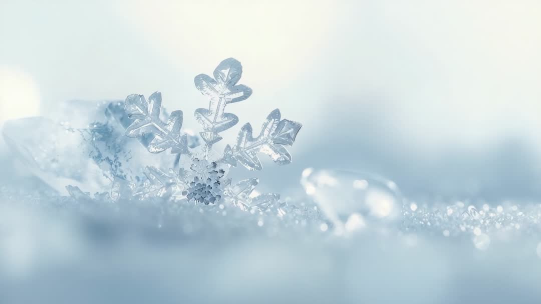 AI Generated Video. Showing extreme close-up of single faceted snowflake settling on frosty surface, video capturing intricate sixfold symmetry and fine crystalline detail. Soft cool palette and shallow depth of field creating soothing bokeh backdrop while tiny droplet resting nearby adding secondary focal point. Slow-motion sequence revealing delicate melting and light refracting through crystal arms, producing sparkling highlights and shimmering texture across granular snow. Ideal for winter advertising, holiday greeting motion graphics, seasonal website banners, social media reels, nature and science storytelling, educational content about crystallography, or calming background for mindfulness and relaxation videos. Providing ample negative space for overlay text and logo placement, suitable for horizontal video projects and broadcast use.