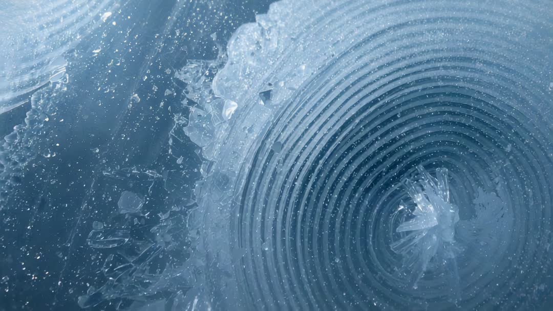 AI Generated Image. Video showing extreme close-up of concentric rings forming in translucent ice, revealing fine radial grooves, starburst microcrystals, and suspended air bubbles. Camera pulling in tight, exposing layered circular bands and sparkling frost fragments against cool blue palette. Footage fitting science and nature projects, weather or climate storytelling, abstract art installations, product packaging, and digital backgrounds. Use ideas showing hero background for landing pages, creating motion graphic overlays, forming title sequence elements, enhancing social media reels, supporting editorial illustrations for geology and cryosphere topics. Editing recommendations: loop short segment for seamless animation, apply subtle vignette and clarity boost, push blue-cyan tones for chilled mood, add slow zoom or parallax for cinematic depth. Suitable for stock licensing, commercial campaigns, scientific visuals, interior art prints, and multimedia presentations.