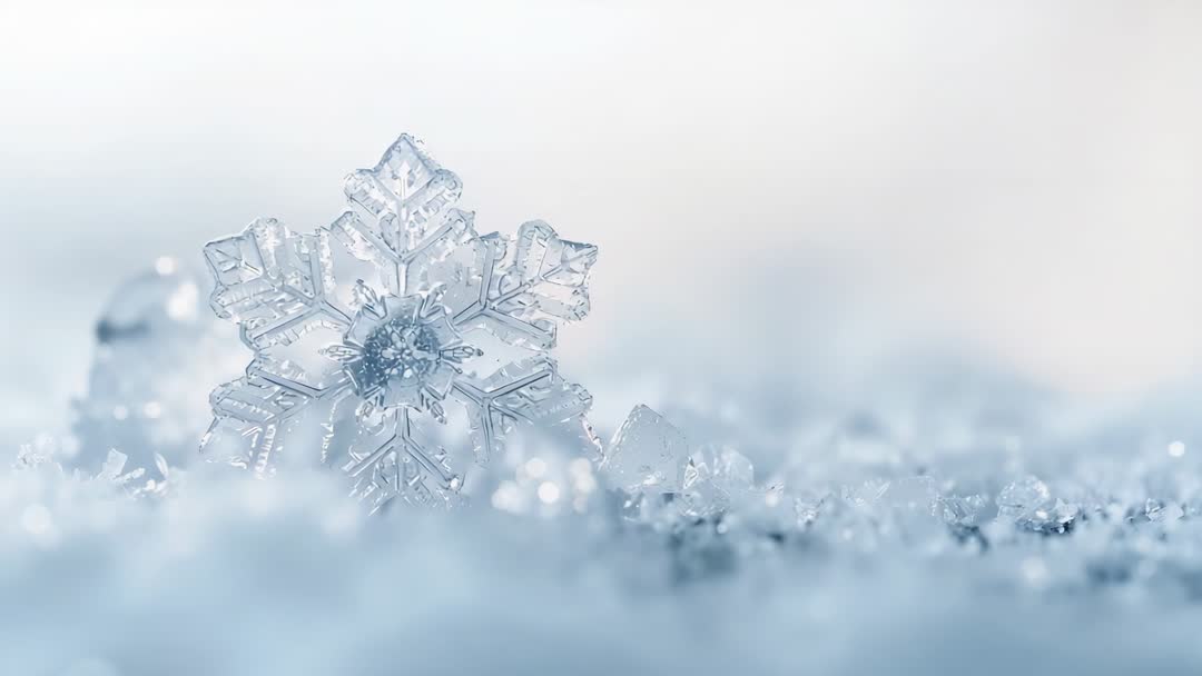 AI Generated Video. Showing macro focus pull revealing intricate hexagonal snowflake resting on frosty surface with sparkling bokeh highlights. Capturing delicate crystal geometry and subtle light refractions for educational and creative use. Serving winter campaign backgrounds, holiday card motion elements, nature documentary close-ups, science presentations about crystallography, product adverts for cold-weather gear and frozen goods. Supporting use in web hero banners, social media reels, broadcast lower thirds and looping background animations. Providing clean minimal composition with negative space for easy text overlay and color grading.
