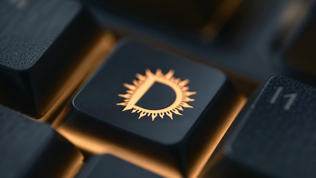 AI Generated Image. Showing extreme macro closeup of D keycap engraved with sunburst emblem, bathed in warm amber backlight. Camera pulling back and tilting, revealing textured key surface, rounded edges and soft bokeh from surrounding keys. Highlighting bronze tones, subtle glow and cinematic contrast for premium tech feel. Suitable for product promo for custom keycaps and mechanical keyboards, hero background for web banners and landing pages, social media ads, YouTube tech intros, and broadcast spots. Working as atmospheric loop for motion graphics, UI overlays, and advertising transitions. Pairing well with ambient music, ASMR typing audio, or voiceover about hardware craftsmanship, lighting design, or brand identity.