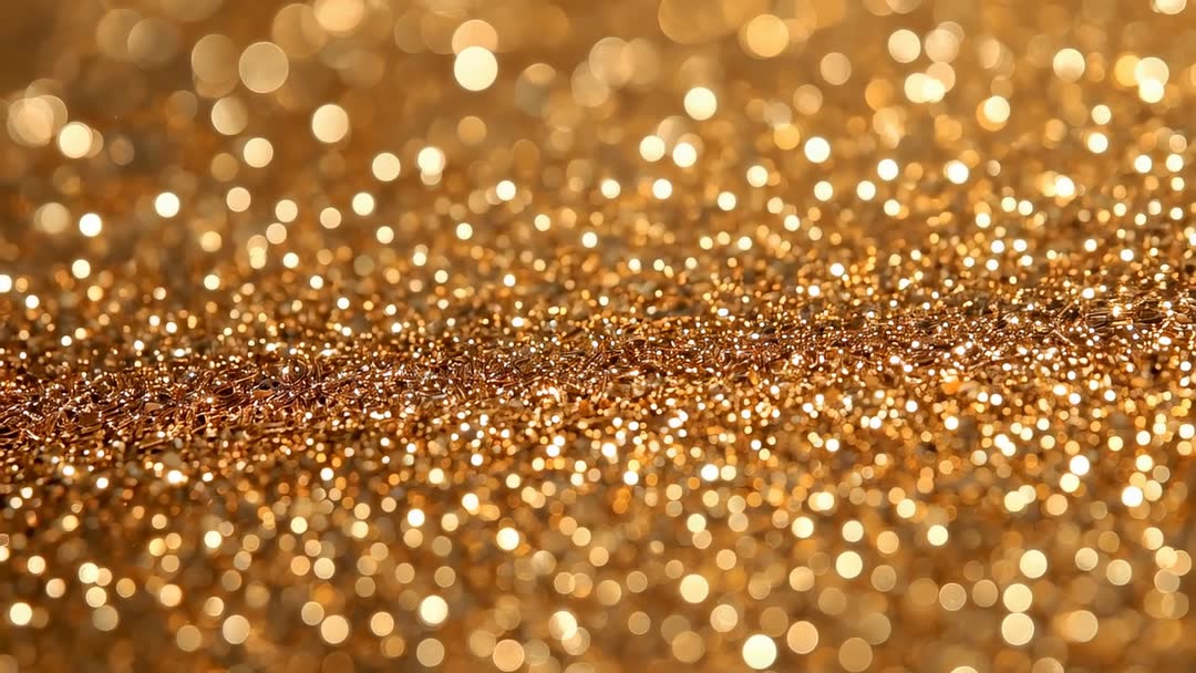 AI Generated Video. Video showing extreme close-up macro focus shift across golden glitter and metal flakes, creating creamy bokeh and sparkling highlights. Foreground granules providing tactile texture while midground focus revealing intricate metallic fibers. Warm gold color palette and shallow depth of field creating luxurious, festive mood. Ideal for background loops in motion graphics, title sequences, product promos for jewelry and beauty, holiday and celebration visuals, website hero banners, social media stories, and packaging animations. Editing suggestions: employing soft pan or slow zoom, applying overlay or screen blend modes, adding subtle film grain or vignette, and speed-ramping for dramatic reveal. Suited for looping and repeating playback, allowing color grading and cropping for multiple aspect ratios.