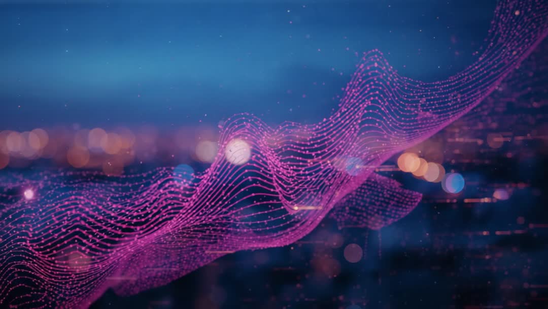 AI Generated Image. Featuring magenta dotted mesh ribbon flowing across blurred urban lights and bokeh, creating immersive sense of depth and kinetic flow. Showing layered particle lines pulsing and weaving with smooth parallax movement, ideal for conveying data, connectivity, and AI concepts. Perfect for tech branding, AI and data visualization, music visualizers, broadcast intros, website hero backgrounds, app splash screens, product demos, social media ads, and event visuals. Loopable clip with seamless motion and adjustable color grading, suitable for overlay with titles, lower thirds, or kinetic typography. Recommended uses: place under soft blend modes for atmospheric backdrop, sync particle motion to audio for dynamic promos, crop for vertical formats for social stories.