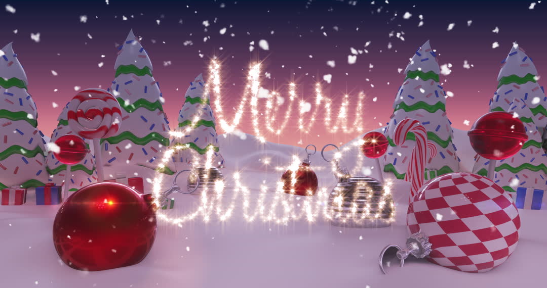 This animated Christmas greeting showcases 'Merry Christmas' sparkling against a snowy landscape. The background features snow-covered trees and colorful ornaments such as Christmas balls and candies. This visual can be used for personalized holiday messages, festive greetings, or enhancing holiday-themed multimedia content with a magical touch.