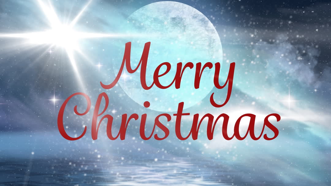 Atmospheric scene features Merry Christmas message in bright, elegant text over mystical moonlit sky. Ideal for Christmas cards, festive greetings, or holiday decorating ideas that capture spirit of Christmas magic and wonder. Perfect for sending digital wishes or enhancing social media holiday posts.