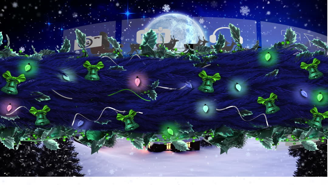 This digital creation depicts a magical Christmas scene with animated snowfall in a winter wonderland backdrop. Snowflakes gently drift across the ambience, creating a tranquil snowy atmosphere complemented by a full moon in the background. Vibrant Christmas lights and evergreen decorations, adorned with green bows and bells, enhance the festive spirit. Perfect for use in holiday greeting cards, seasonal marketing materials, social media posts, or digital backgrounds emphasizing Christmas and holiday festivities.