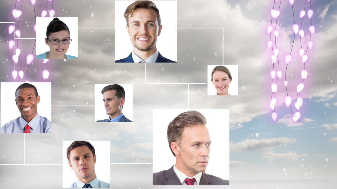This composition features framed portraits of professional individuals overlaying a cloudy sky background, intertwined with whimsical, glowing lights. This imaginative blend creates a sense of connection, collaboration, and professionalism. Snow effects and ambient illumination suggest a winter or festive context, making it perfect for themes relating to corporate teamwork, social networks, or blended family dynamics, especially in seasonal promotions and digital marketing.