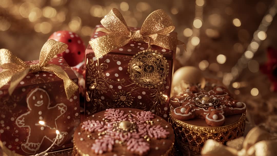 - Magical Holiday Scene with Gift Boxes and Gingerbread Cookie