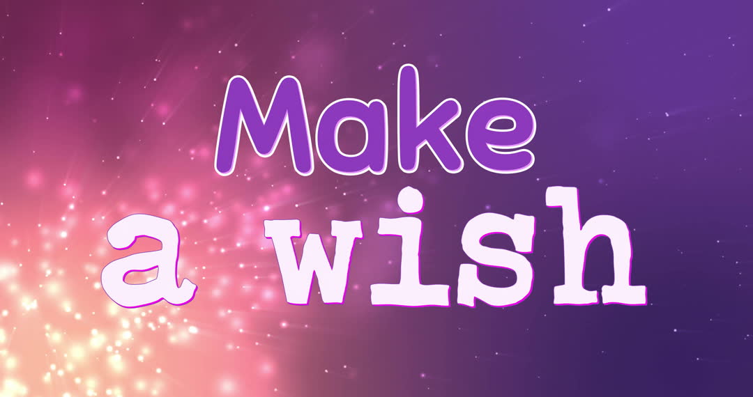 Colorful animation depicts the phrase 'Make a wish' set against a pink and purple background with sparkles and gleams. Ideal for use in birthday celebrations, holiday greetings, inspirational quotes, motivational content, social media posts, digital invitations, and wishful thinking themes.