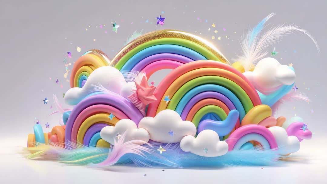 AI Generated Video. A dreamy pastel-colored composition depicting rainbow arches surrounded by soft cloud puffs, drifting feathers, and sparkling glitter elements. This whimsical design conveys feelings of serenity and magical wonder, making it ideal for uses in children's decor, greeting cards, or any setting that requires a peaceful and imaginative aesthetic. Suitable for marketing or artwork evoking fantasy themes.