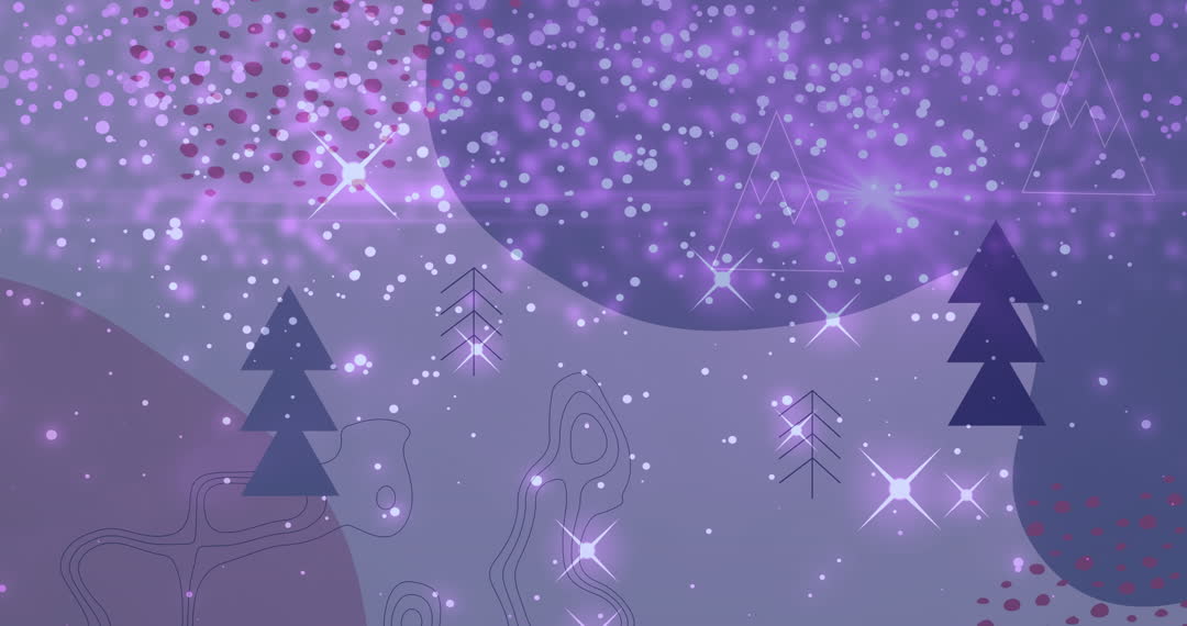 Fantasy winter scene depicting snowflakes gently descending onto stylized Christmas trees under a starry night sky. Soft glowing lights and a purple hue emphasize a cozy yet festive atmosphere. Ideal for holiday greetings, digital Christmas cards, festive digital invites, and seasonal backdrops.