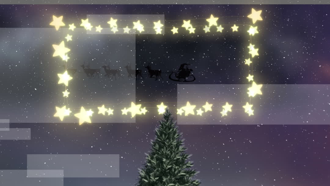 Santa Claus traveling across a starry, snow-filled winter sky in a magical, festive animation. Ideal for holiday-themed marketing, Christmas greeting cards, festive digital content, and creating a cheerful atmosphere. Perfect for use in seasonal decoration designs and promotional material for winter events.