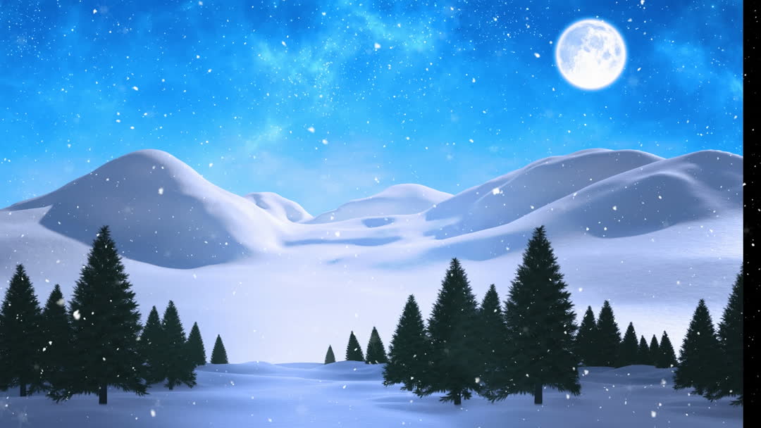 Serene snowy mountain landscape with gently falling snow, dark silhouetted pine trees, and bright full moon in a clear blue sky, evoking a magical winter wonderland feeling. Ideal for use in holiday greeting cards, festive banners, or digital winter-themed decorations, highlighting the tranquility and beauty of winter nights.
