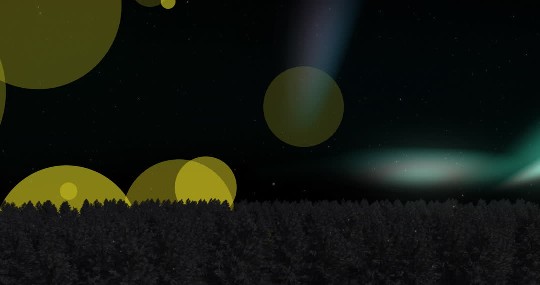 Vibrant digital animation showcasing silhouette of forest of fir trees against dark, star-filled sky. Surreal yellow spots create magical atmosphere ideal for festive themes, Christmas concepts or whimsical backgrounds. Uses include graphic design projects, seasonal promotions or as tranquil animation backdrops.