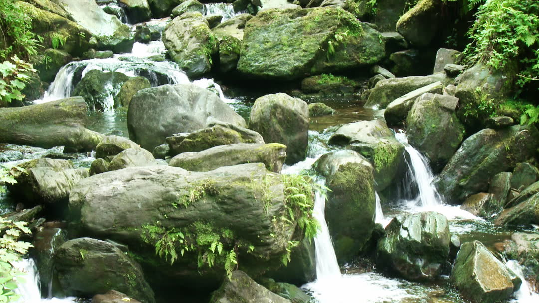 Flowing through rocks surrounded by lush greenery, this serene mountain river captures the tranquility and majesty of nature. Excellent for nature and travel promotions, environmental awareness campaigns, and meditative or wellness content highlighting peaceful and natural beauty.
