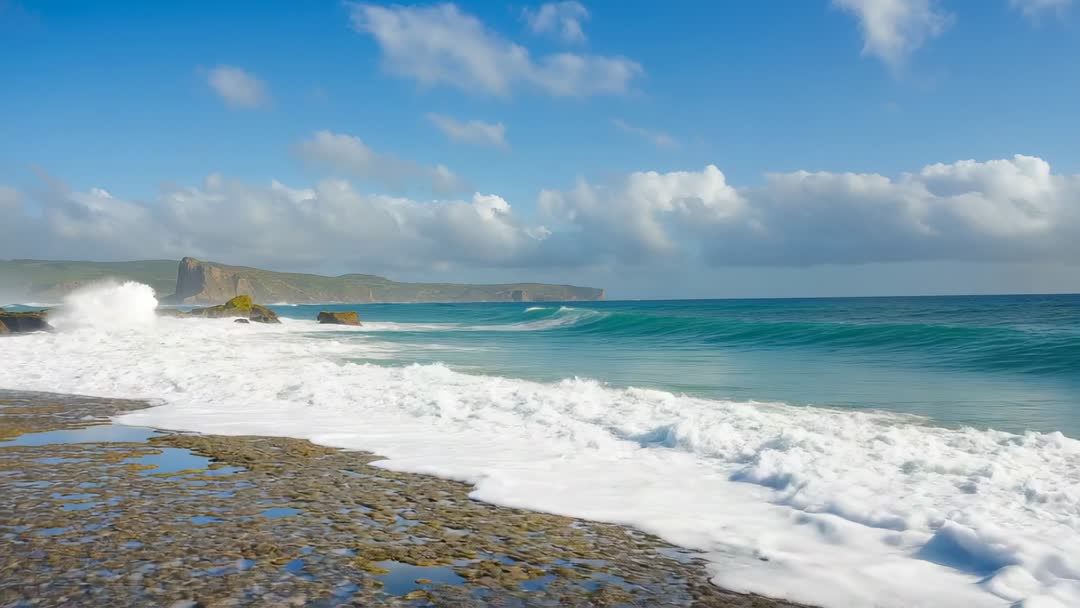 AI Generated Image. The video showcases powerful ocean waves continuously rolling and crashing onto a rugged rocky shoreline. Foam spills across the tide pools as distant coastal cliffs stand under a bright blue sky lined with softened clouds. This dynamic seaside panorama is ideal for promoting travel destinations, illustrating serenity in nature, and visual presentations about coastal environments.