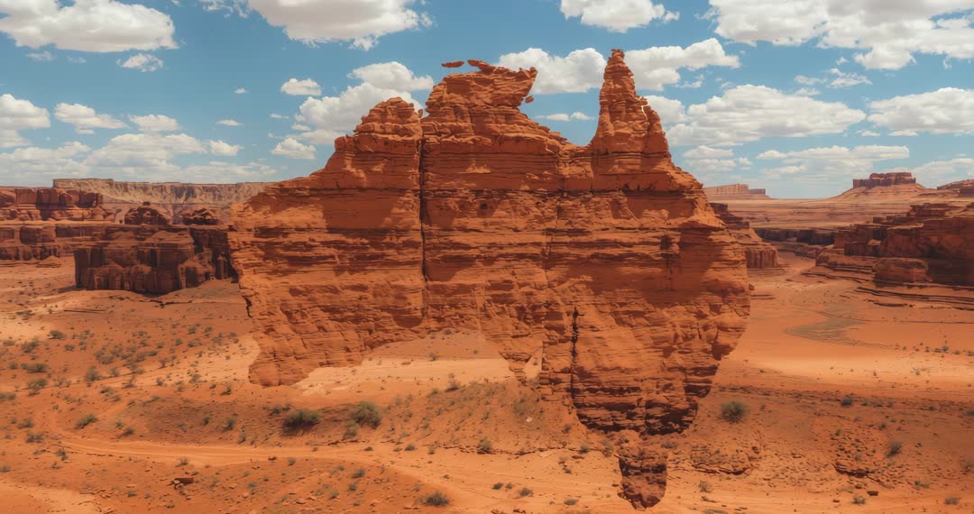 AI Generated Image. This scene captures the awe-inspiring beauty of a towering sandstone spire against a backdrop of drifting cumulus clouds creating stunning shadow play across the arid desert terrain. Ideal for depicting natural beauty and geological formations; suitable for use in educational materials about desert environments or digital art projects highlighting landscapes.