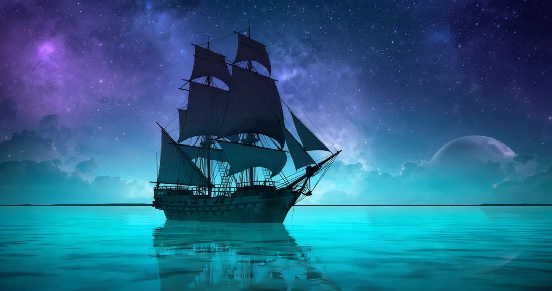 - Majestic Ship Sailing Under Starlit Sky in Tranquil Waters