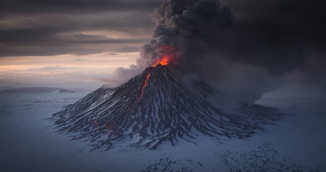 - Majestic Volcano Erupting with Ash and Lava in Winter Twilight