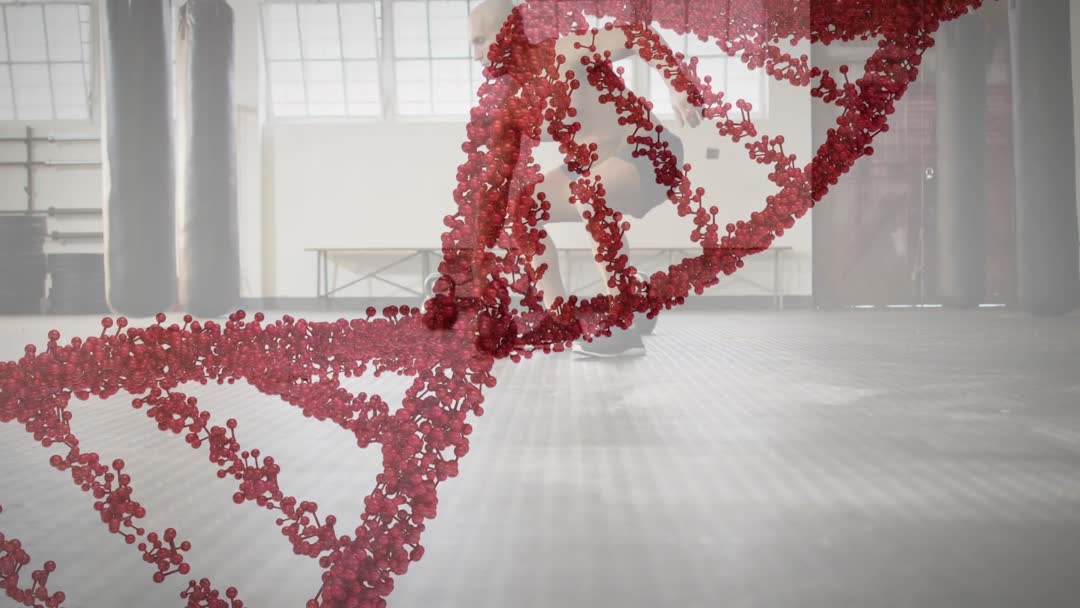 - Male Athlete Performing Lunges with CGI DNA Helix Overlay Conveying Fitness Genetics