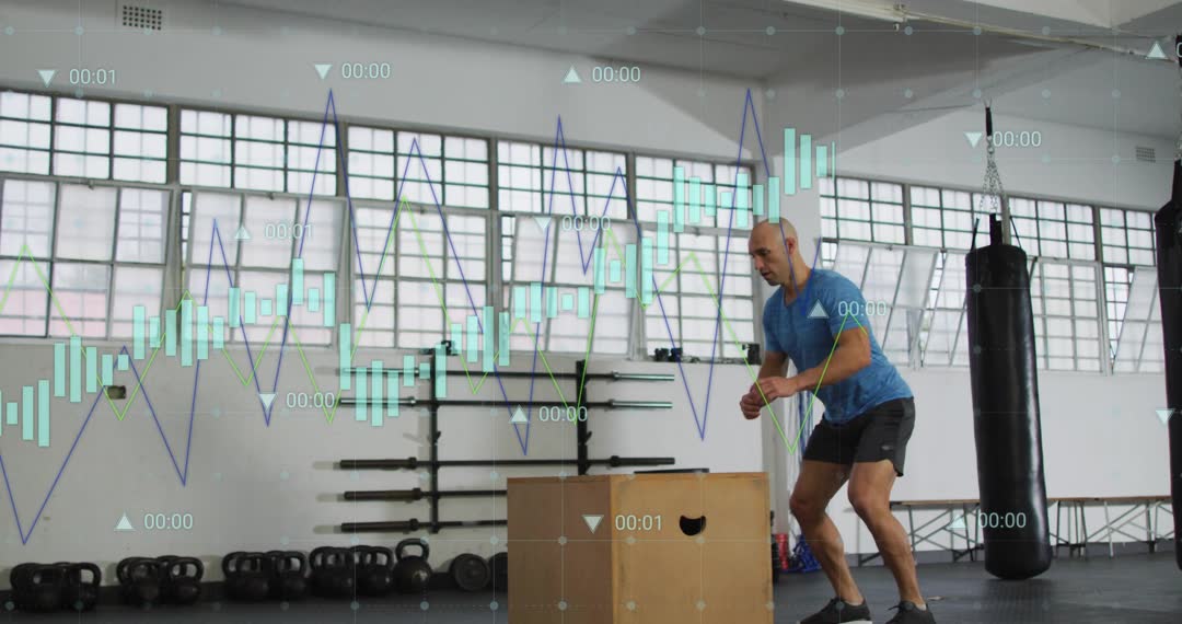 - Male athlete performing plyo box jumps with performance data overlay in gym training video