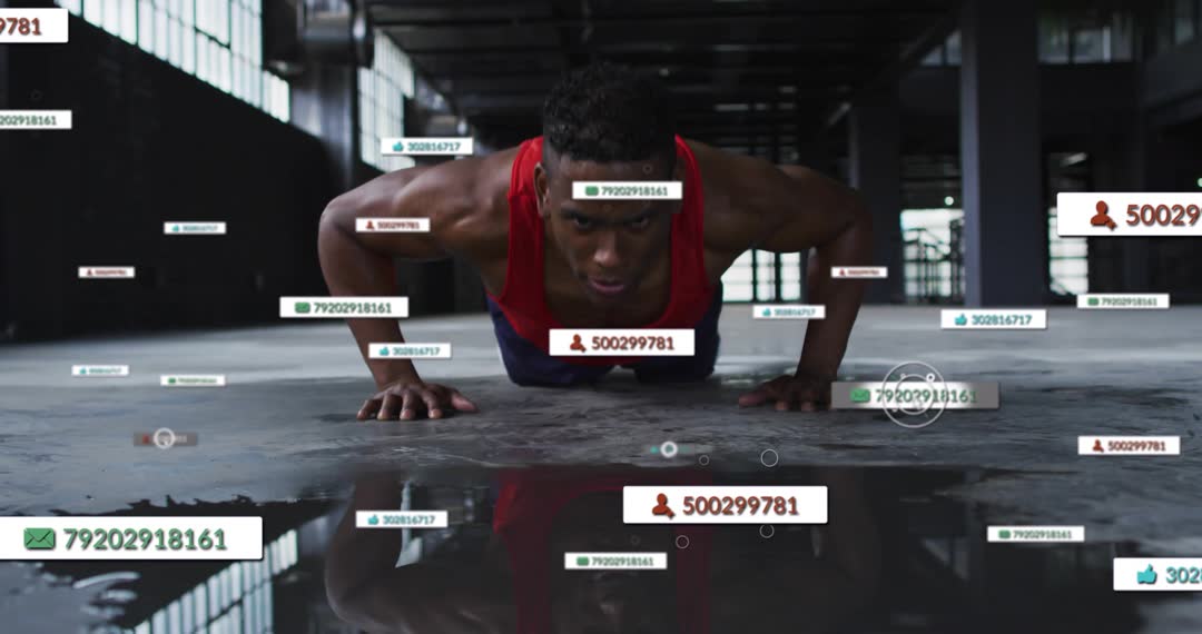 Video showing male fitness athlete performing pushups on concrete floor inside industrial warehouse with augmented HUD tags tracking form and reflecting in puddle. Clip featuring low-angle perspective, strong reflections, industrial architecture, and overlaying motion-tracking graphics, creating high-tech athletic atmosphere. Useful for promoting fitness apps, demonstrating AR coaching systems, illustrating motion-tracking technology, enhancing workout tutorials, creating social media reels, supporting articles about sports analytics, and branding gyms or athletic apparel. Working well with lower-third data, HUD transitions, or split-screen edits; allowing color grading to moody cinematic tones and easy integration into marketing, editorial, or technology demo projects.