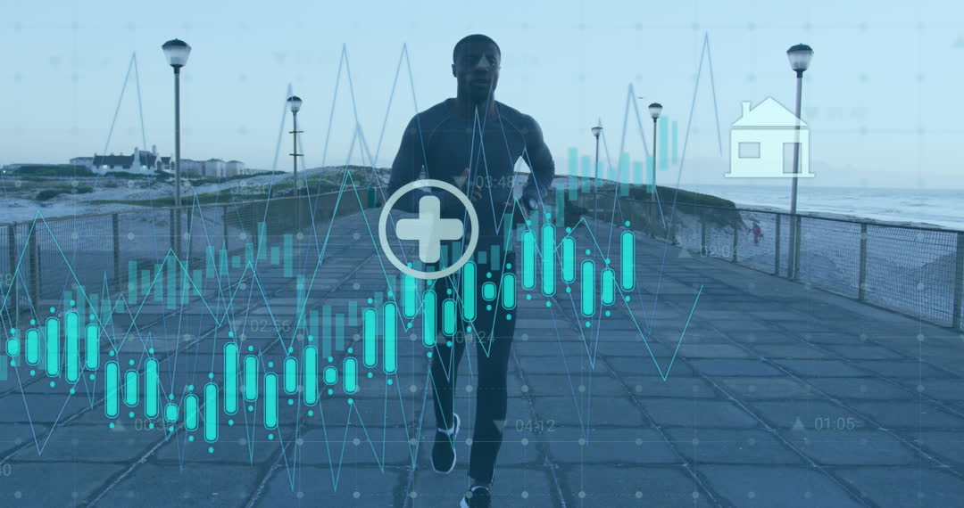 This dynamic composition depicts an athletic individual engaging in a morning run along a scenic seaside promenade. Digital graphics, including various graphs and medical icons, overlay his figure, suggesting themes of health monitoring and data analysis. Ideal for use in articles or advertising related to fitness technology, health research, wearables, or app/medical technology development.