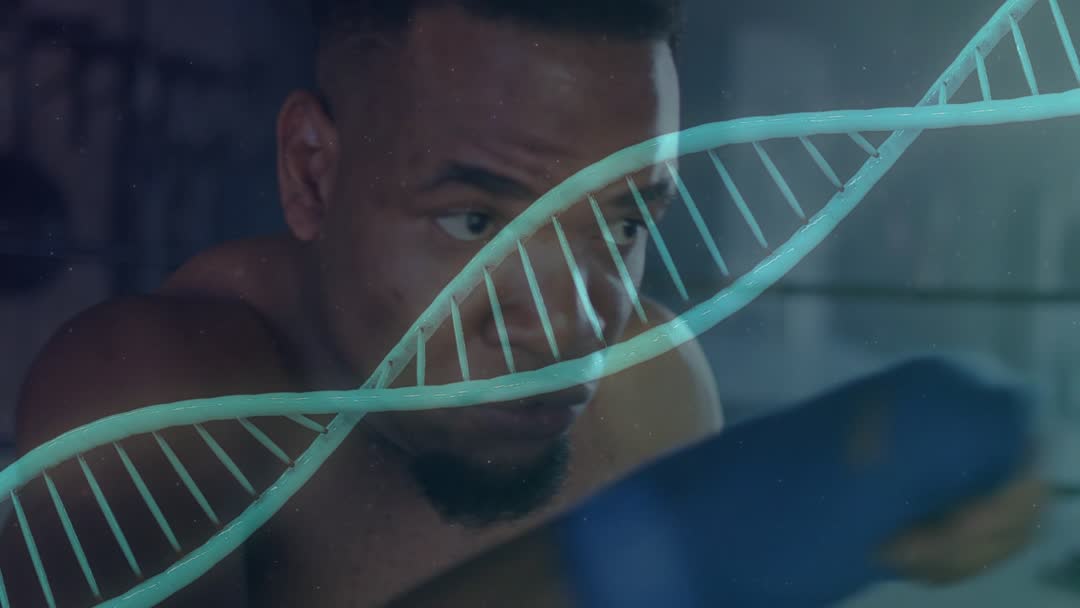 - Male boxer training with wraps and focused breathing while teal DNA helix highlights form