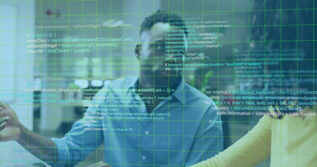 Video showing male coworker pointing at laptop while coworkers analyzing code and data on screen. Semi-transparent green grid and scrolling code overlay moving across frame, creating futuristic data-visualization look. Office team collaborating around laptop, gesturing and discussing UI and debugging flow. Use for software development tutorials, tech company websites, product demos, corporate presentations, training videos, cybersecurity and data analytics marketing. Visual mood modern, collaborative, professional, analytical; color palette cool teal and green highlights. Compatible with overlay of text, titles, lower thirds for explainer videos, website hero banners, social media ads, investor pitch decks.