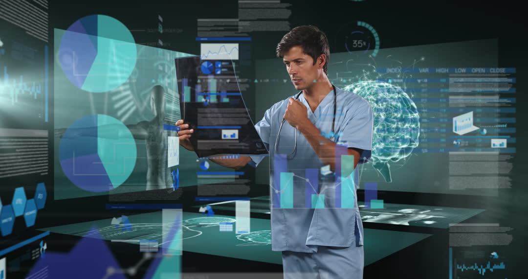 - Male Doctor Analyzing X-Ray with Advanced Digital Data in High-Tech Environment
