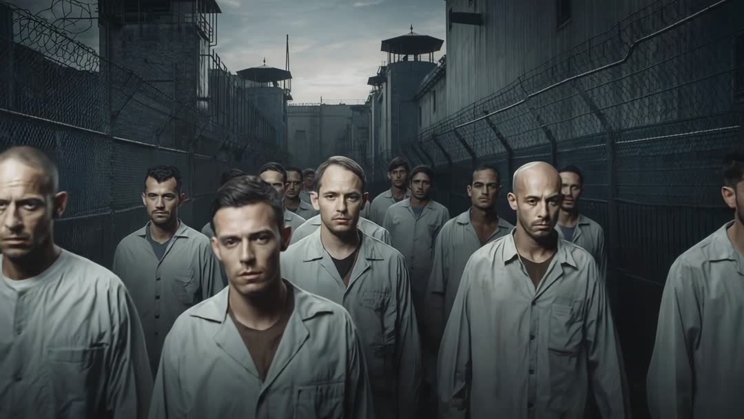 AI Generated Image. Clip showing male inmates walking in formation down narrow corridor flanked by high chain-link fences topped with barbed wire and silhouetted watchtowers. Lighting presenting cool, desaturated palette with heavy shadows, creating tense, oppressive atmosphere. Camera holding centered composition on advancing group while background guards and towers remain distant, supporting sense of confinement and control. Use in documentary sequences exploring incarceration, prison life, criminal justice, or prison reform campaigns. Use as opening sequence or transitional B-roll for crime dramas, true crime series, investigative reports, training materials for corrections staff, or social impact campaigns. Edit-friendly framing and camera movement allowing cropping, color grading, slow motion, or audio overlay. Suitable for establishing shots, coverage plates, or VFX compositing. Mood and composition working well for promotional materials, editorial features, news packages, or educational content about correctional systems. Provide keywords for easy discovery on stock libraries.