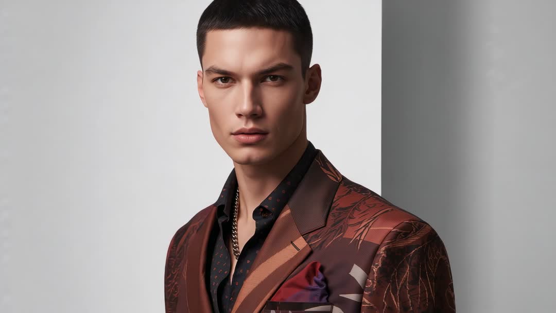 AI Generated Image. Video showing male model standing square-on in studio, camera zooming out to reveal patterned blazer with abstract textured duotone print. Model wearing dark patterned shirt, chain necklace, folded pocket square adding color contrast. Soft directional lighting highlighting tailoring and fabric texture, neutral backdrop keeping focus on garment. Framing starting tight on face then widening to full torso and jacket details so visual attention moves from facial expression to jacket craftsmanship. Usage ideas: using clip for ecommerce hero banner, social media reel, fashion campaign teaser, editorial lookbook, styling tutorial, or model portfolio showcase. Tips for editors: trim clip to 5-10 seconds for looping, add subtle music and headline overlay, freeze-frame for thumbnail highlighting label or price tag, crop to vertical 9:16 for Instagram Reels and TikTok or to square for social feed. Ideal for branding, product pages, advertising, and runway-inspired content looking to emphasize fabric, fit, and modern styling.
