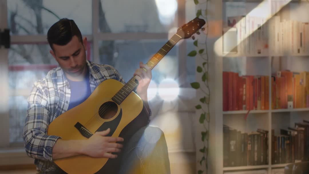 A male musician is playing the guitar, adjusting the strings for precise sound as swirling bokeh lights fill the room. This scene captures a blend of melodious passion and cozy aesthetic, perfect for portraying musical dedication or the tactile nuances of an acoustic performance. This can be used in promotional videos for music festivals, stock footage in advertisements featuring musical themes, or as background for aspiring musician stories.