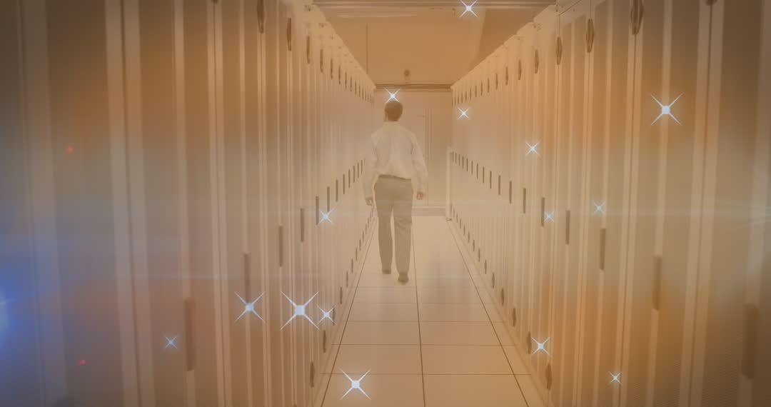 Image captures a male technician walking through a brightly lit data center corridor, with animated stars overlay. The futuristic and digital ambiance makes it ideal for marketing IT services, technology firms, cybersecurity themes, and presentations related to digital business solutions.