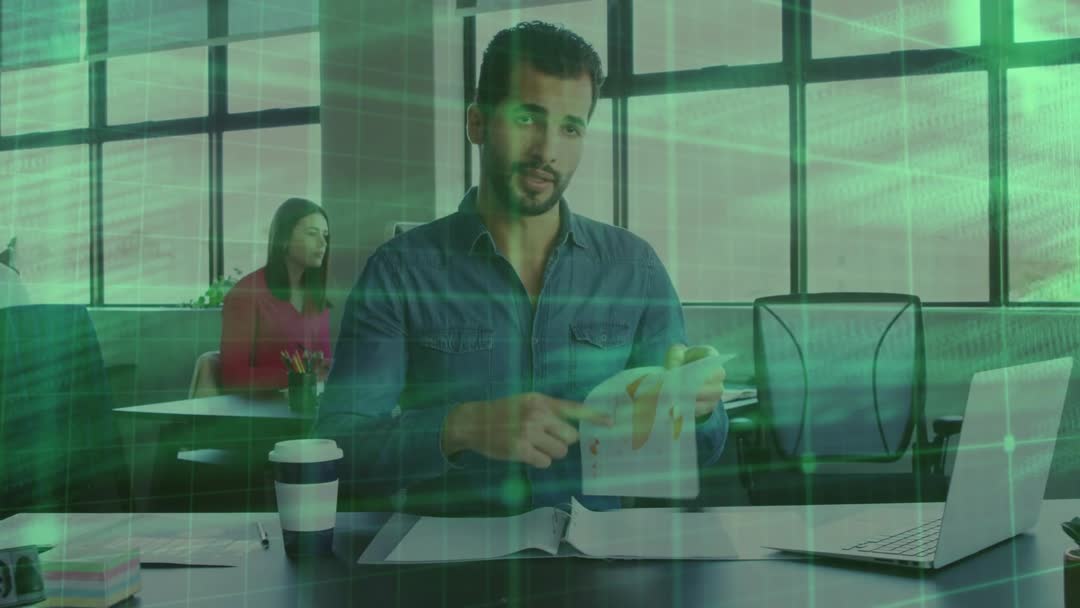 This video frame features a professional in an office reviewing a printed document against a digital code grid overlay, symbolizing the intersection of physical and digital realms in modern work dynamics. Ideal for illustrating concepts related to technological collaboration, productivity in digital workplaces, or innovation in modern business environments. Useful for presentations, commercials, or articles focused on technological advancements in office settings.