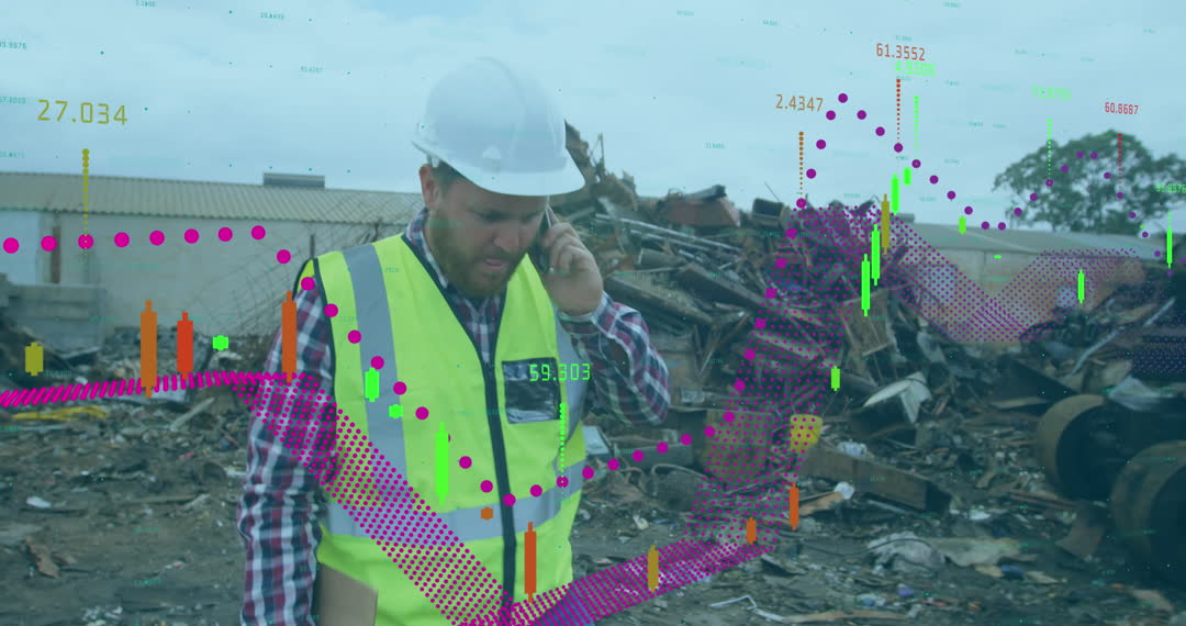 A workman wearing a hard hat and fluorescent safety vest communicates on a phone amidst a trash site. Overlays of bar and line graphs along with dynamic numbers suggesting concepts of data analysis, technology, waste management, and industrial surveying appear around him. Suitable for articles on environmental technology, waste analytics, safety practices in waste management, or digital innovation in recycling.