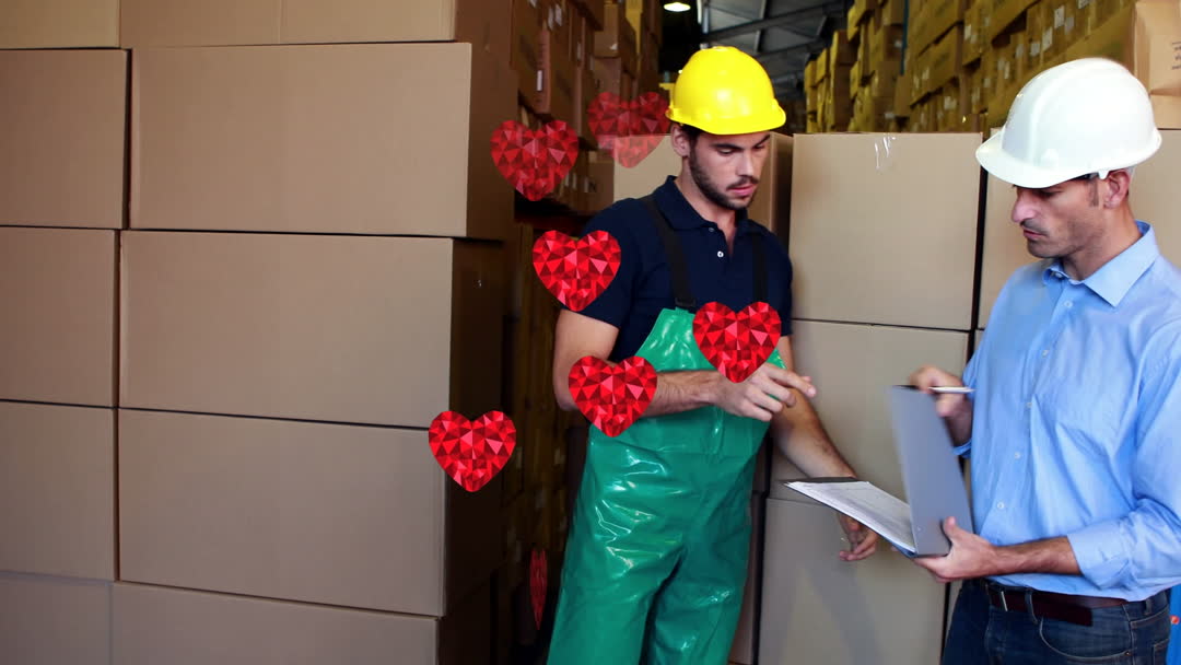 Male Workers Coordinating in Warehouse with Heart Icons Video