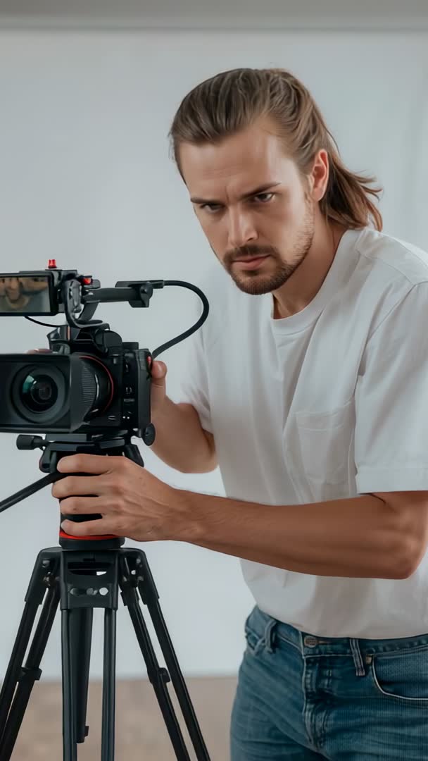 AI Generated Video. Featuring man adjusting camera and tripod for vertical studio filming while checking external monitor and composing shot. Close-up view of hands operating tripod head, camera controls, and lens with emphasis on rig, LCD monitor, and framing. Mood projecting focus, professionalism, and technical precision. Use cases include promoting camera gear, teaching tripod and camera setup, showing behind-the-scenes for film projects, producing vertical social media content, illustrating cinematography blog posts, supporting equipment rental listings, and enhancing creative portfolio presentations. Editing suggestions include cropping for vertical mobile layouts, color grading to warm cinematic tones, adding lower-third text for tutorial or branding, and stabilizing footage in post if needed. Delivery ideal for 9:16 vertical video, short-form social clips, website hero reels, and training course modules. Model release recommended if subject recognizable.