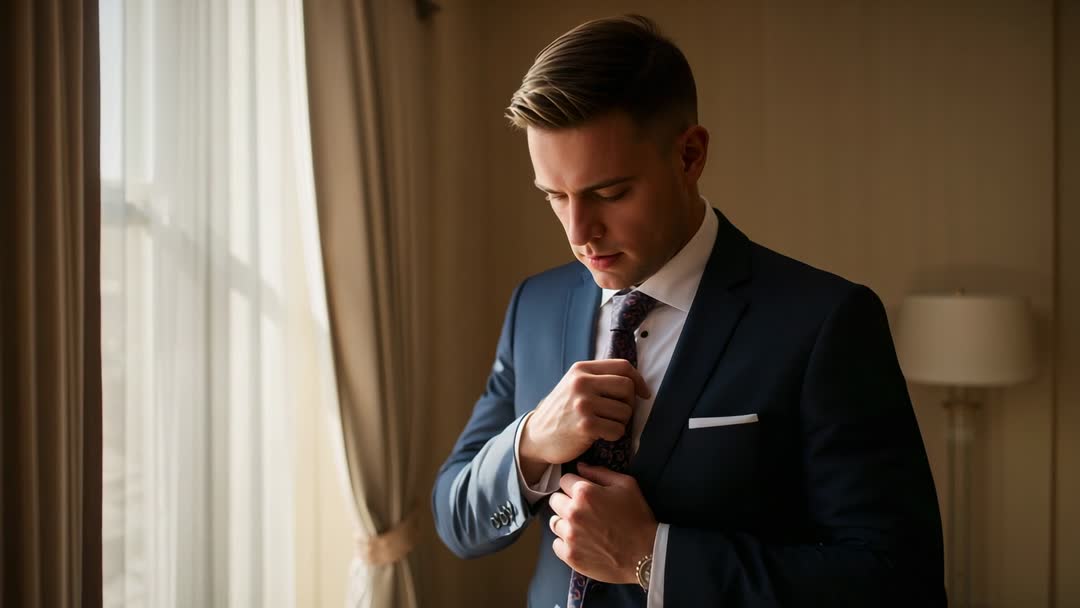 AI Generated Image. Short video clip showing man adjusting patterned tie while preparing for formal event inside luxury hotel room. Close-up framing focusing on hands, tie knot, cufflinks, wristwatch, and tailored navy suit, conveying calm focus and meticulous grooming. Footage working well for wedding day preparation scenes, corporate lifestyle storytelling, menswear advertising, hotel and hospitality promotion, and grooming or watch brand spots. Editing suggestions: pairing with soft piano or ambient room sounds, using gradual push-in for dramatic tension, cutting to wide reveal for context, and adding warm color grade for elegant mood.
