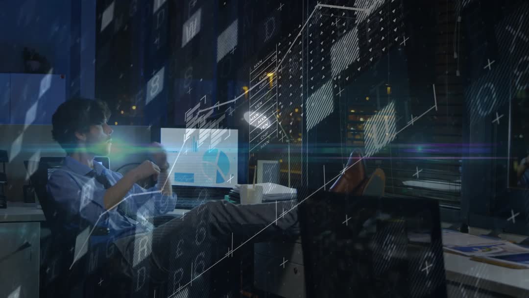Man Analyzing Financial Data with Animated Overlays at Night Video