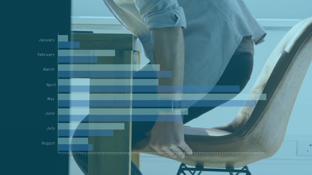 Caucasian man's midsection at office desk combined with a dynamic overlay of financial graphs illustrating company growth and data analysis. Suitable for use in presentations focused on business strategy, finance trends, or productivity. Ideal for depicting topics related to business analysis, economic growth, and work environment efficiency.