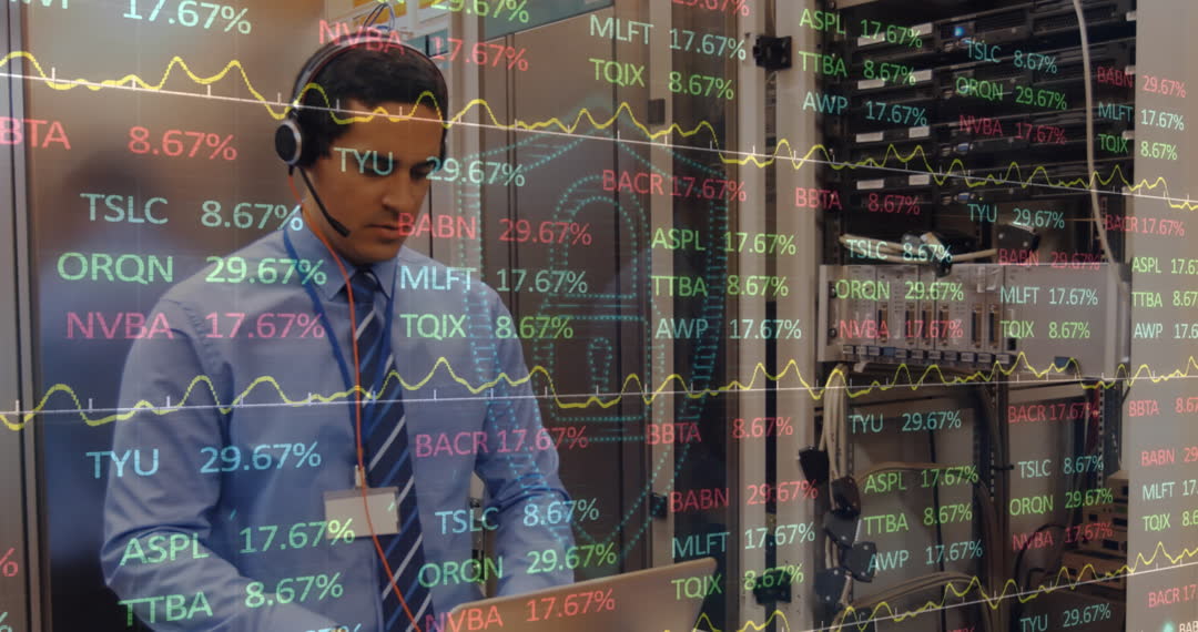 Businessman in formal wear analyzing stock market data on his computer, with transparent financial charts overlayed. Headset suggests engagement in financial trading or tech support. Suitable for illustrating finance, market analysis, trading environments, technology usage in business, or professional training scenarios.