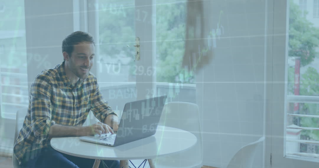 This video showcases a man engaged in analyzing stock market data on his laptop, with overlaid graphs and trading board elements signifying a focus on investment analysis and financial technology. Ideal for use in content related to trading platforms, investing strategies, online learning for stock offerings, financial planning services, or business technology presentations.