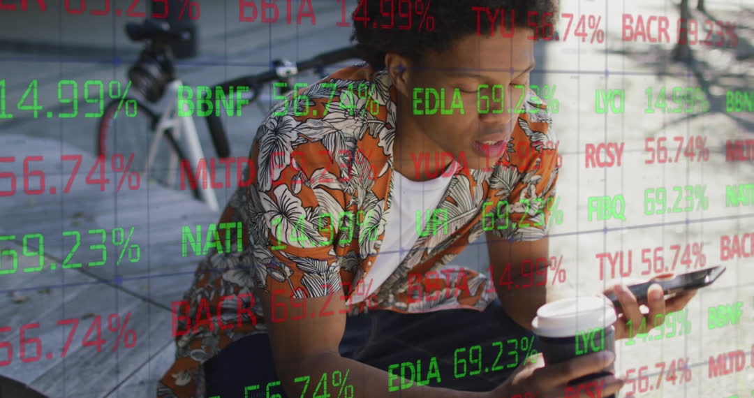 Young biracial man drinking coffee while engaging in a phone conversation outdoors, layered with animated stock market data, symbolizes the blending of daily life with global financial trends. Ideal for themes of remote work, financial management, modern communication, and investment strategy. Can be used in articles about personal finance, investments, or technology in finance.