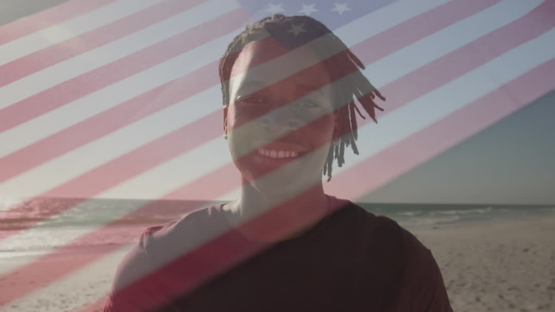 A man with an overlay of the USA flag stands at a sunlit beach, conveying themes of American patriotism and diversity. Ideal for concepts related to national pride, cultural inclusivity, summertime, and the celebration of independence. Useful for promotions or campaigns in patriotism, tourism, and diversity representation.