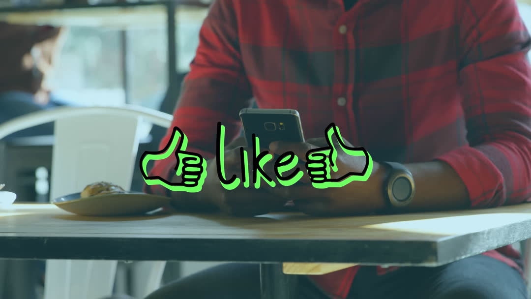 African American man is engrossed with a mobile phone while sitting at a cafe table, where 'like' with thumbs up animations highlight connectivity themes and engaging design. Perfect for conveying digital interaction, social media influence, or technology's role in daily life.