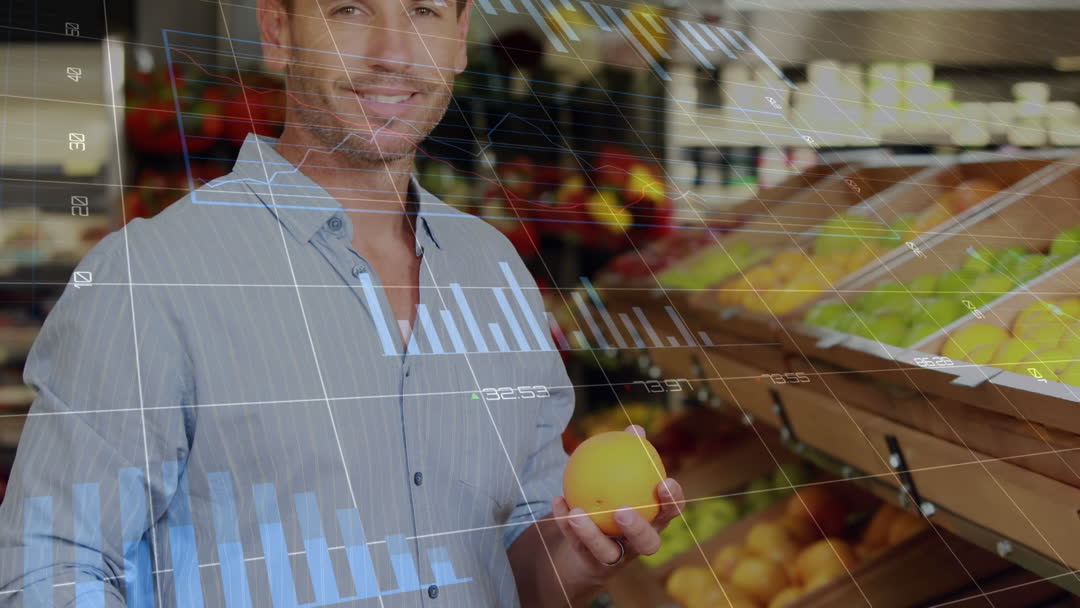 Smiling man holding fruit at grocery store with business graphs overlay illustrating data analysis and consumer trends in retail. Suitable for concepts related to financial analytics, market research, digital commerce, and consumer spending patterns. Useful for blogs, presentations, and articles on retail industry insights and technological impacts on shopping experiences.